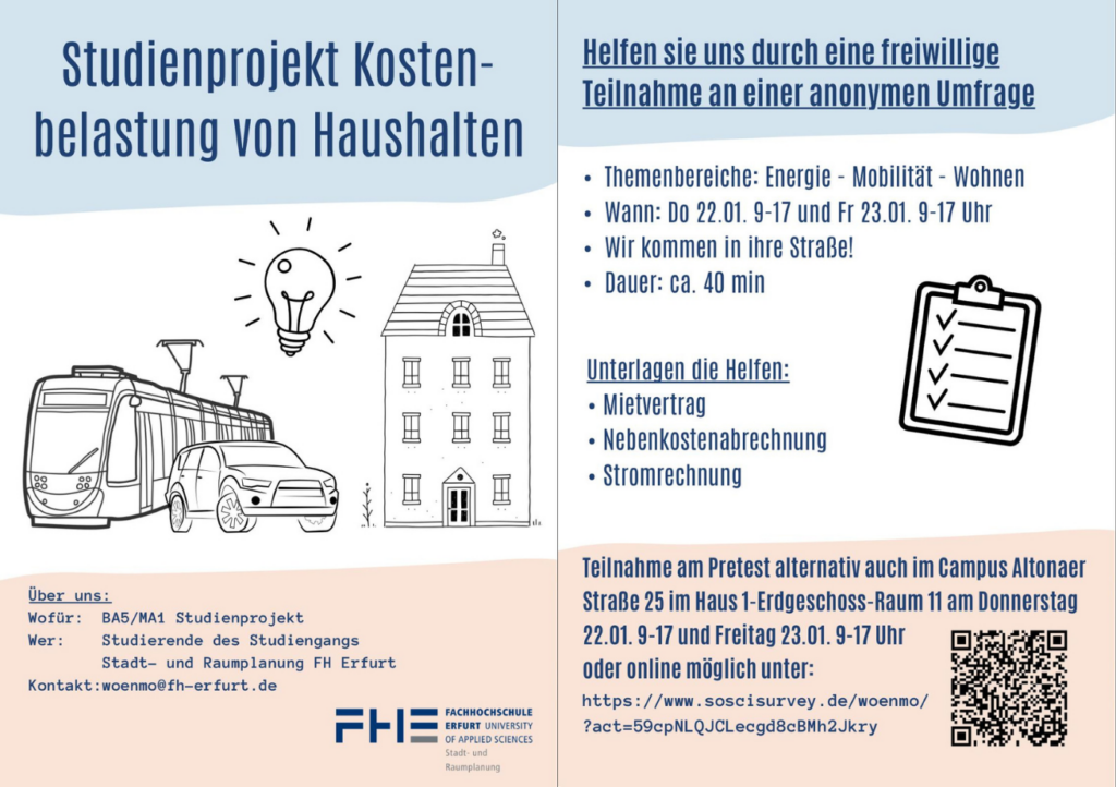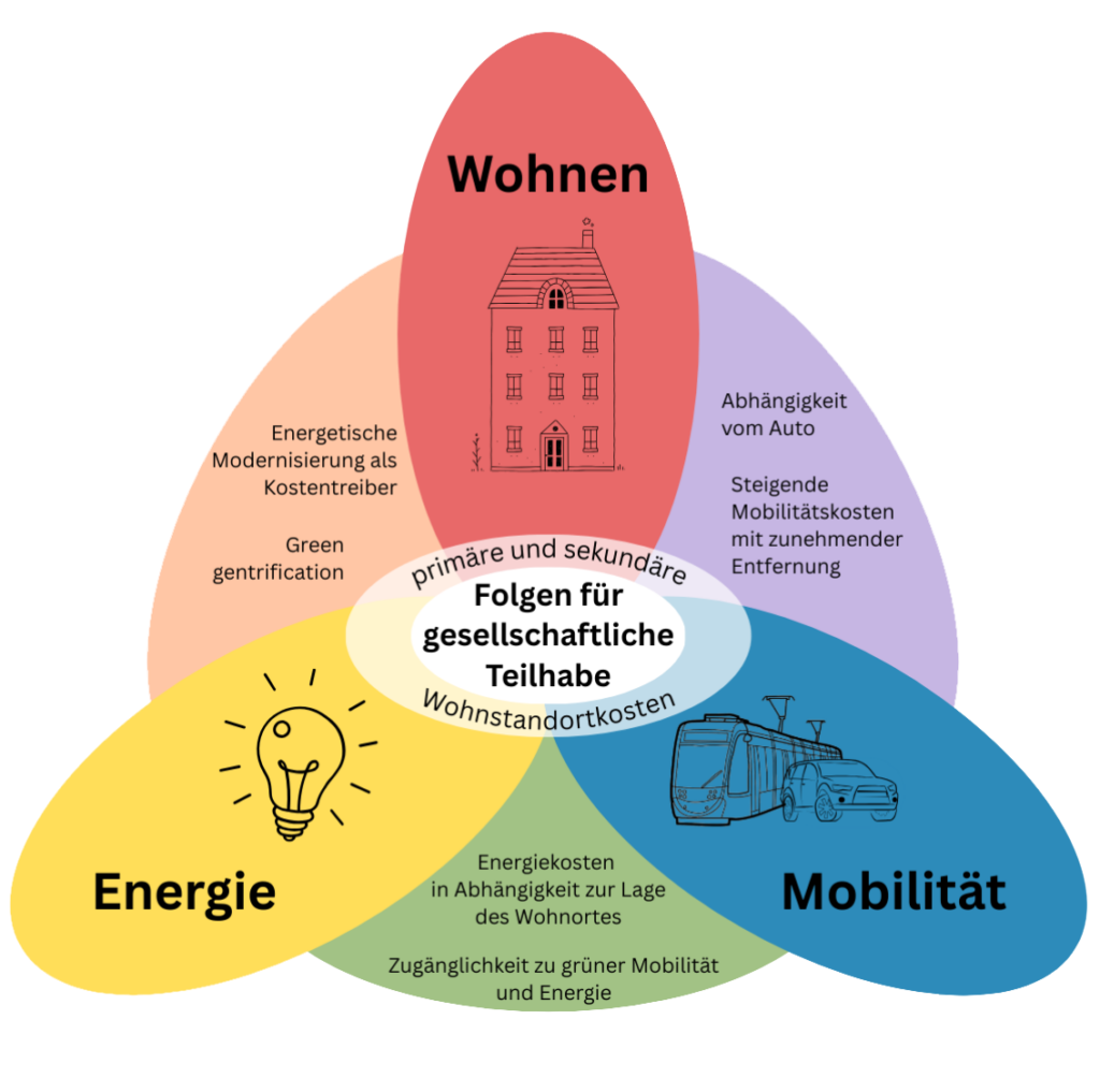 Viele Haushalte haben hohe Alltagskosten. Dazu gehören Kosten für Wohnen, Energie und Mobilität. Diese drei Bereiche hängen oft direkt zusammen. Wer weiter weg wohnt, braucht öfter ein Auto. Wer in schlechter gedämmten Wohnungen lebt, zahlt mehr für Energie. Steigende Preise können die Belastung erhöhen. Das betrifft nicht alle gleich. Wohnstandortwahl, Verdrängung und soziale Segregation spielen dabei eine Rolle. Unser Forschungsprojekt untersucht diese Zusammenhänge. Ziel sind Handlungsempfehlungen für Wohnungs-, Energie-, Mobilitäts- und Sozialpolitik. Das Projekt heißt WoEnMo (Wohnen, Energie, Mobilität)